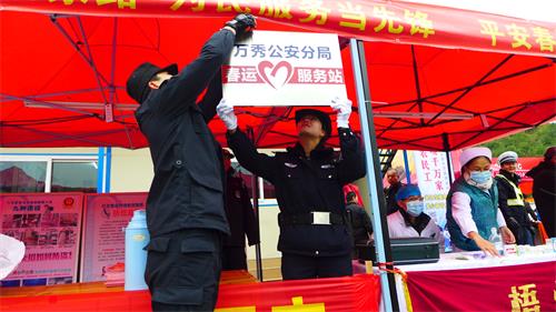 2016年春运于1月24日开始,万秀公安分局民警一如既往投身于东出口春运服务站,在服务站设立治安执勤服务岗点,为摩托车返乡人士提供平安和谐有序的治安环境和良好热情周到的服务。与往年不同的是,分局今年春运期间增加了一辆春运流动服务车,在东出口各个固定服务站、服务点进行不间断的流动服务,如有需要,摩托车返乡骑行人员招手即停,为他们处理各种应急突发性事情。流动服务车上,放置有医药箱(内备有感冒药、创可贴、冻伤膏等药品)、摩托车维修工具和食品、热水,为沿线返乡摩托车大军提供应急救助和服务。流动服务车将各个站点连接起来,确保了春运服务不留死角不留真空,扩大了春运摩托车骑行大军服务的辐射范围。