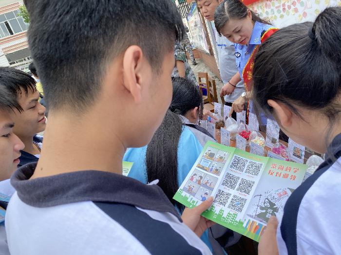 同时,为了使学生更加了解征兵政策和其他法治知识,除了集体宣讲活动外,在学校操场上,工作人员还利用摆设“宣传摊点”、悬挂横幅、张贴海报、发放宣传资料等形式向学生们进行反邪教、扫黑除恶、国家安全宣传,展示毒品仿真模型,学生们踊跃参观。他们表示对于这些知识很是好奇,是在课堂上学习不到的内容、是高考里没有的知识面。工作人员面对面给学生答疑解惑,起到了很好的效果。