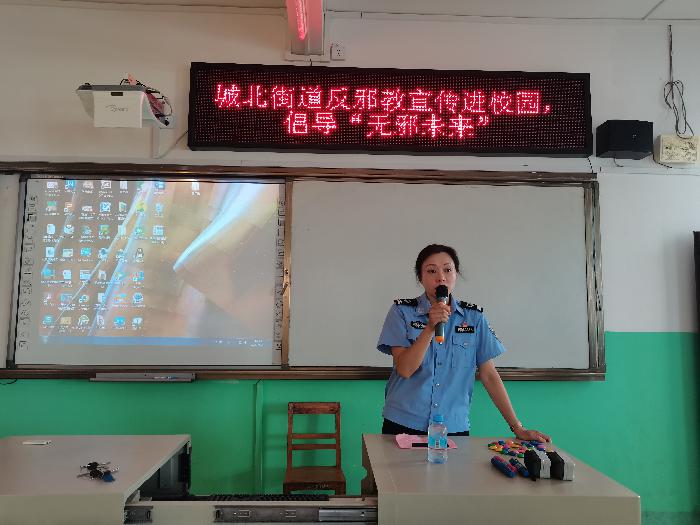 在课堂上,城北司法所宣讲员王一旋从什么是邪教、邪教有什么特征、遇到邪教活动怎么办等方面向同学们做了详细讲解。“希望同学们从小不信邪教、反对邪教、远离邪教,要相信科学好好学习,做好祖国未来的接班人,遇到邪教要及时报警或向家长报告……”王一旋在课堂上向学生们倡议。