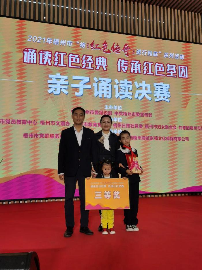 在教育孩子方面,陆华梅夫妻经常带孩子参加城市清洁、文明交通劝导等志愿服务活动。在今年的党史学习教育系列活动中,陆华梅夫妻和孩子一起参加了梧州市组织的亲子诵读红色经典活动。夫妻二人用一言一行,向孩子传递着勤劳、向善、向上的良好家风家教,单位同事们也纷纷点赞。