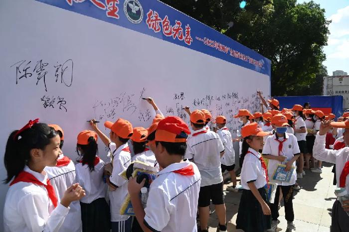 “吸了毒品就会毁了一生,要提醒家人远离毒品以及谨慎交友,使毒品更加远离我们,遇到这种贩毒的人,要报告警察叔叔,维护我们城市的健康。”梧州市大东路小学小陈同学说。志愿者、现场群众也纷纷在禁毒签名墙上签名,用实际行动抵制毒品、净化社会环境,从自己做起、从身边做起,共同参加无毒家园创建,推进平安梧州、万秀建设。