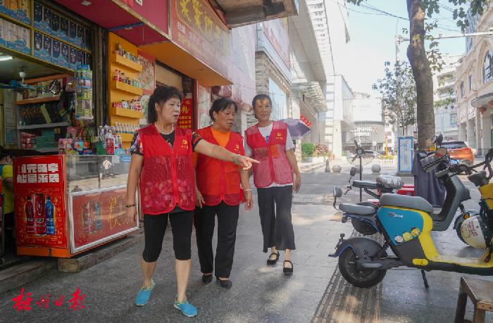 “骑楼大妈”在居仁路巡逻,监督沿街商户注意治安安全和“门前三包”。杨扬 摄(资料图片)