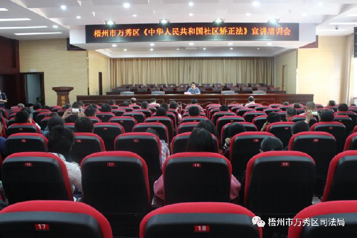 2020年11月9日,万秀区举办为期一天的全区人民调解员、综治专干、农村法律助理员、法律援助联络员等人员法律法规培训班暨第四季度提升群众安全感工作推进会。在法律法规培训班上,由万秀区司法局副局长黄俊向全区基层干部讲授《中华人民共和国社区矫正法》。