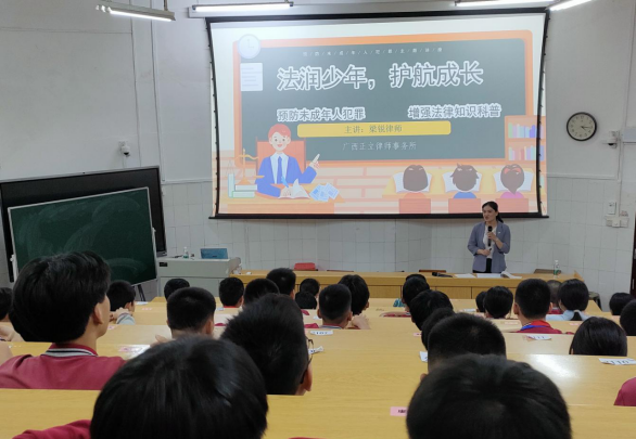 6月4日下午,富民司法所干部联合富民街道东山社区法律顾问、市第五中学法律顾问、广西正立律师事务所梁锐律师,到市第五中学开展“法润少年 护航成长”法治宣传活动,梁锐律师从犯罪和未成年人的关系、刑事责任年龄立法现状及趋势、未成年人犯罪的社会因素等方面入手,一一列举典型案例给同学们讲述违法犯罪的后果,教育同学们要“学法以明道 用法以立身”。在律师阐明法理之后,富民司法所所长吴清连则从情理入手,从前途、自由、家庭、经济、友情、健康等六方面,给同学们算了算违法犯罪的“六笔账”,告诫同学们未成年不是违法犯罪的免责金牌,只要触碰到法律的红线,都会受到相应的处罚;也教育同学们,要遵纪守法,珍惜美好的青春,积极向上,不要让看似平凡的幸福,成为难以祈求的奢望。