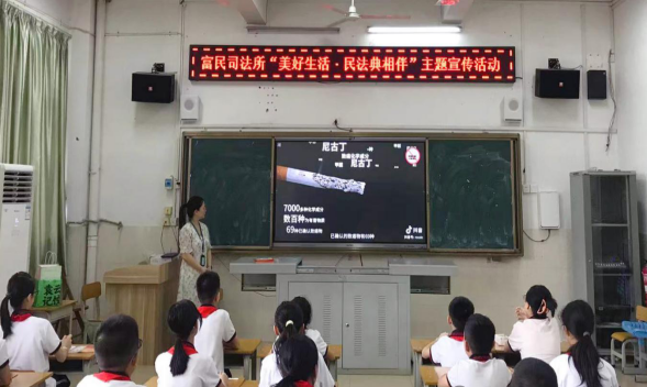 富民司法所所长吴清连在活动中,给同学们宣讲了人格权、民事行为能力有关法律规定,给同学观看了《民法典》《5·31世界无烟日》等宣传片,教育同学们要学法禁烟禁毒,并准备了精美礼品组织开展有奖问答活动,寓教于乐,在六一儿童节到来之际,让大家既学到法律知识又收获开心。