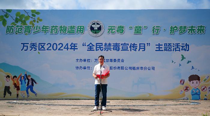 6月21日上午,梧州市万秀区2024年“防范青少年药物滥用”暨“无毒‘童’行 护梦未来”全民禁毒宣传月主题活动在鸳江丽港广场举行。区委常委、政法委书记、区禁毒委常务副主任莫君出席活动并讲话。
