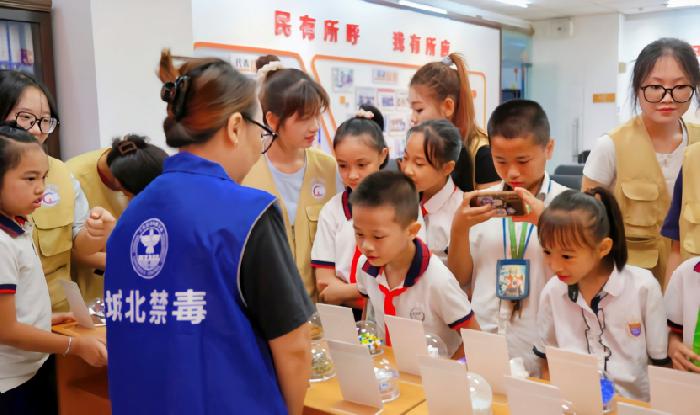 在禁毒知识有奖问答环节,现场气氛热烈,同学们积极的举起小手,踊跃地回答问题,禁毒宣传工作人员为答对的同学送上礼品,掌声不断。随后同学们观看了五颜六色、各式各样的仿真毒品模型,使他们更加直观地认识毒品,城北街道禁毒社工、网格员还给同学们分发了禁毒宣传手册并给同学们讲解禁毒知识,同学们听后纷纷表示要将学到的知识向家人及朋友宣传,大家一起远离毒品、抵制毒品。