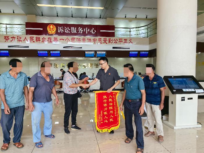 近日,刘某某等数名申请执行人怀着激动的心情,将一面印有“人民法院为人民,执行得力暖人心”的锦旗,送到梧州市万秀区人民法院执行局法官的手中,对法院为他们追回欠薪表示感谢。