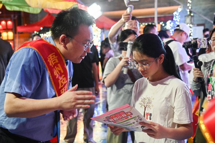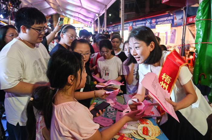 入夜之后的明朝两广总督府,人潮涌动,热闹非凡。梧州“漓泉杯”粤菜大赛暨首届漓泉啤酒音乐节将美食、国潮游乐等融为一体,让新潮美食与古风古韵相互碰撞,成为满足全家人游玩出行、网红打卡的宝藏地。在景区的反邪教宣传展板前、宣传摊位上,不停有市民或驻足观看,或交流互动。在活动主舞台,循环滚动播放的反邪教标语也引起了市民的注意……