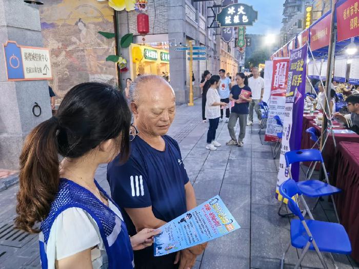 6月28日晚,梧州市2025年百日千万招聘专项行动——走进社区服务重点企业用工夜市专场招聘会在骑楼城热闹开场。城南街道南中社区积极响应,充分利用招聘会人员聚集的契机,同步开展普法宣传活动,为居民带来了一场别开生面的 “普法夜市服务”。