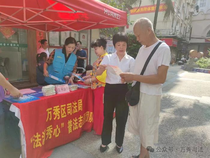 活动现场设置了法律咨询台,万秀区司法局“法润秀心”普法志愿团队工作人员为居民发放了《民法典宣传手册》,讲解了民法典的编纂历程、基本原则以及与居民生活密切相关的物权、合同、婚姻家庭、继承、侵权责任等法律知识,并耐心解答居民提出的法律问题,引导居民关注法律热点,增强法治观念。