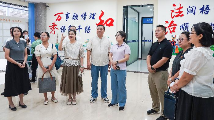 调研组还实地调研了城南街道南中社区,依次参观骑楼大讲堂、儿童之家、心灵驿站、骑楼大妈工作室等普法维权阵地。对全国“三八”红旗集体骑楼大妈志愿服务队在日常巡查中发挥政策宣讲员、邻里纠纷调解员、基层治理巡查员作用的做法表示肯定。并对进一步整合多方资源、强化家暴源头预防机制、深化法治宣传教育实效、推动形成反家暴工作更大合力等方面,提出了具体指导意见。