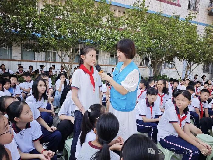 第三实验小学的“开学第一课”融合爱国与法治教育。校门口,少先队员迎宾,新生有序入班,师生在抗战主题墙合影;开学典礼上,升旗仪式后,五年级的大孩子们化身“法治小卫士”,手持法治宣传标语,在舞台上炫酷“走秀”,正式拉开了普法活动的序幕。万秀区司法局副局长祝瑾与孩子们一同进行法治问答,在一来一回的抢答中,法律知识以轻松愉快的方式,进入了大家的脑海里。此外,东兴司法所还联合东兴派出所、东兴街道办事处,通过护苗“绿书签”活动、毒品模型展示、禁毒知识讲解等形式,聚焦“预防未成年人犯罪”核心,详细讲解“不良行为”与“严重不良行为”的界定,引导学生守法律底线。