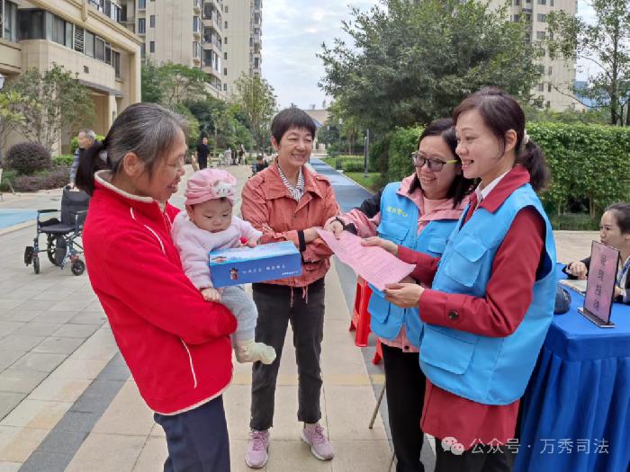 活动现场,万秀区司法局“法润秀心”普法志愿队工作人员化身“法治快递员”,将《中华人民共和国宪法》《中华人民共和国法治宣传教育法》等宣传资料送到居民手中。“宪法是国家的根本大法,与每个人息息相关……”工作人员以“拉家常”的方式,结合日常生活中的典型案例,深入浅出地讲解宪法赋予公民的选举权、受教育权、财产权等基本权利,让抽象的法律条文变得通俗易懂。居民们围坐倾听,不时提问互动,现场气氛热烈。