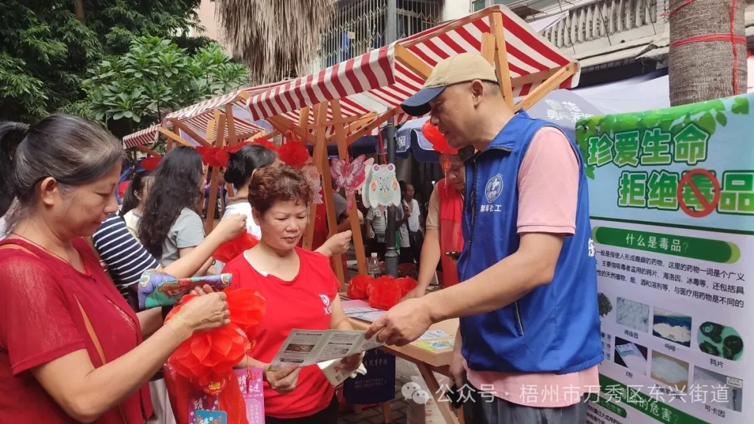 举杯邀明月,拒毒享安康。在国庆、中秋双节同庆之际,为筑牢辖区禁毒防线,营造平安祥和的节日氛围,东兴街道于9月28日至29日,分别在步埠社区月桂花城小广场和三云社区小游园组织开展主题禁毒宣传活动。